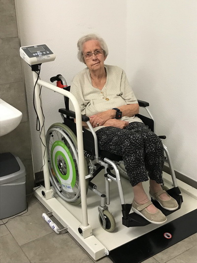 Für Menschen, die in ihrer Beweglichkeit eingeschränkt sind, gib es Rollstuhlwaagen. Der Vorteil dieser Waagen ist, dass die Menschen in ihrem gewohnten Umfeld gewogen werden können und die Verwiegung sitzend erfolgen kann. Der Vorteil der Rollstuhlwaage besteht darin, dass sie über eine große Wiegefläche und eine flache Bauweise verfügt. Auffahrtrampen ermöglichen das Befahren der Rampe mit einem Rollstuhl. Ein Display mit Anzeige für Gewicht und weitere Daten befindet sich an der Seite der Waage.